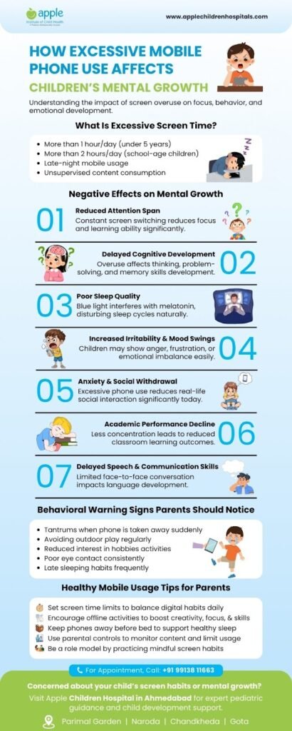 While phones can be useful for learning and entertainment, expert pediatric doctors in Ahmedabad & across the world are now seeing clear signs that too much mobile phone use can affect a child’s mental growth, sleep, behavior, and emotional balance.