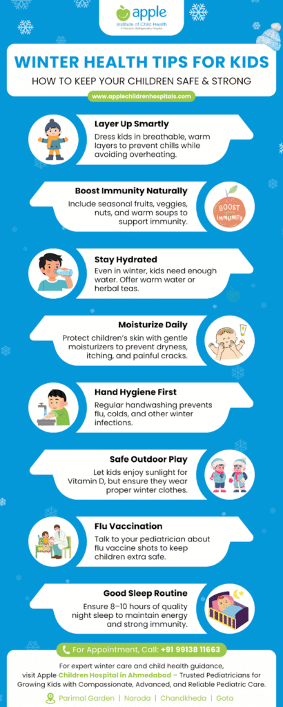 In this guide, we’ll share practical winter health tips for kids from the best pediatrician of Ahmedabad – simple things every Indian parent can do to help their child enjoy the season without falling sick.